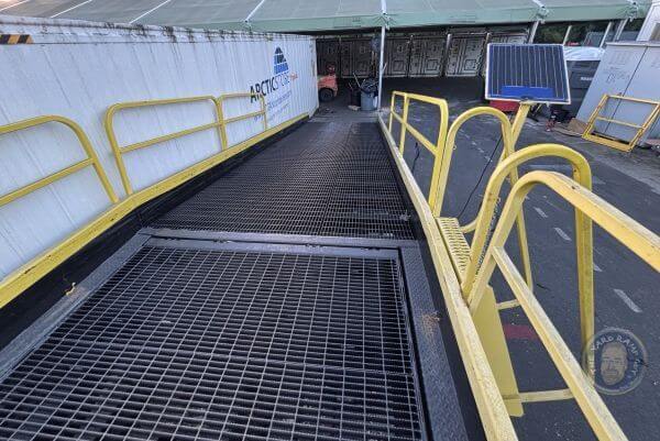 - Safety Features: This ramp includes hydraulic pump, safety chains, solid tires, and steel grating.