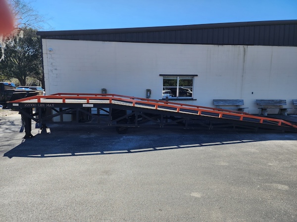 This steel forklift ramp, currently in Gainesville, FL, supports up to 22K lbs. It features an 82-inch deck width and 37-foot overall length with two flip plates at top and two approach plates at bottom. Easily reachable throughout Florida. Freight friendly to Alabama, Georgia, and the Carolinas. Fast delivery and expert turnkey services available.